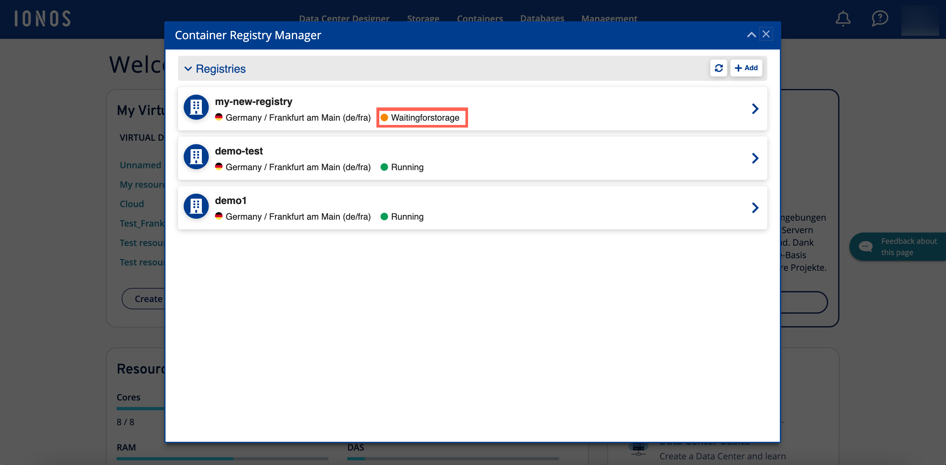 6. Click Add Registry. Your Container Registry and storage will be created.