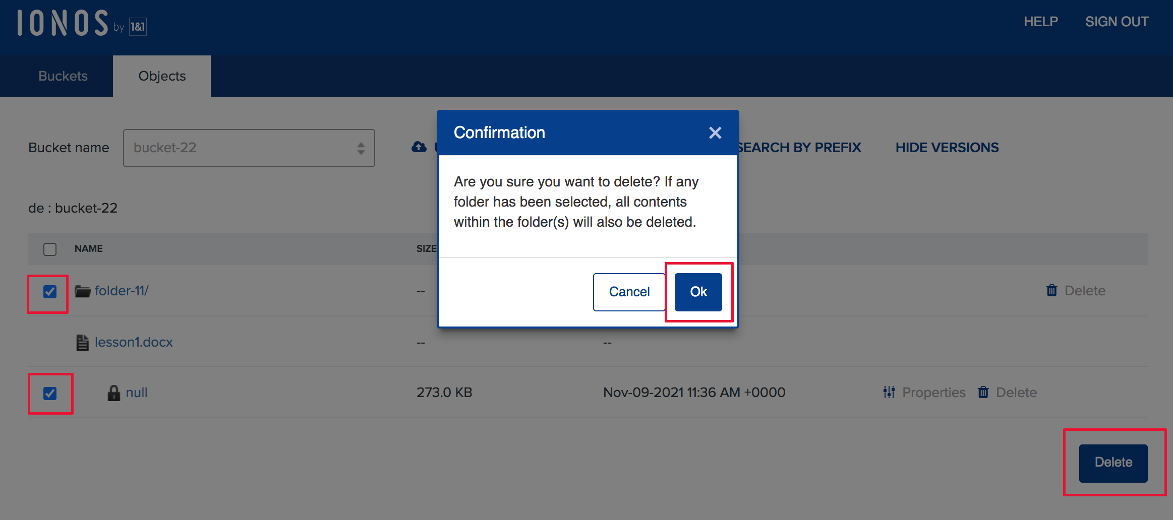 7. Confirm the deletion of selected objects and folders by choosing Delete. If the folder contains objects, you see an option to Empty and delete which deletes all the objects within the folder and then deletes the folder.